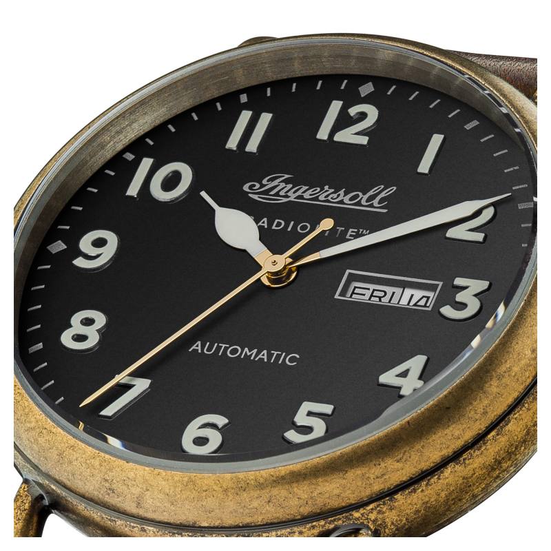 Die Ingersoll CHRONICLE - I03403 The Trenton - ist eine Herrenuhr mit Automatikwerk und zeichnet sich durch folgende Funktionen aus - Stunden, Minuten, Sekunden, Datum, Tag. Das Ziffernblatt ist Schwarz. Die Gehäuseform ist rund. Das Gehäuse ist aus Edelstahl und es ist matt. Die Abmessung des Gehäuses sind Höhe 44 mm, Breite 44 mm und Tiefe 14 mm. Die Ingersoll CHRONICLE - I03403 ist wasserdicht bis 50m. Das Uhrband der I03403 The Trenton ist ein Lederarmband. Die Farbe des Bandes ist Braun. Das Material des Uhrbandes der Ingersoll CHRONICLE - I03403 The Trenton - ist aus Leder. Die Ausführung des Uhrbandes ist matt. Die Länge des Uhrband beträgt26,5mm. Die Breite des Uhrbandes beträgt 20mm. Der Uhrbandverschluss ist eine Dornschließe. Das Gewicht der Ingersoll CHRONICLE - I03403 The Trenton - beträgt 86 Gramm. Das Glas der - The Trenton - ist Mineral Glas. Weiters hat die Ingersoll CHRONICLE - I03403 The Trenton - folgende Sonderfunktionen Tag, Datumsfenster auf 3 Uhr. Die Garantie ist Lebenslang.